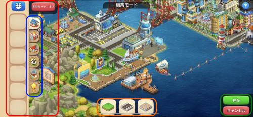 | ■編集モードは慣れると町の開発が更に楽しく■ 地面の置き換え、道の舗装、タイルの設置。 タウンシップでの町作りは感覚的で楽しく、現実では難しすぎる建物の配置換えなども楽に出来ます。 ここでは編集モードの使い方を掘り下げていきます。 ●先ずは基本を押さえましょう● ![]() ゲーム画面左上の矢印アイコンをタップすると編集モードに入ります。 ![]() 編集モード中は建物、畑、装飾品をタップするだけで移動したり回転させたりする事が出来る様になります(普段は長押しが必要でしたよね)。 上の画像は公共施設や特別な建物の場合で、装飾品を選択した場合は画面中央下に「売却」ボタンと「収納」ボタンが並びます。置ききれなくなったら売るか収納して町から消しましょう。 ●編集モードのあれこれ● ![]() 編集モードでやれる事を赤い枠で囲みましたので、まずはその紹介を。 6.終了 解りやすいボタンなので先に。 これを押すと編集モードが終了します。 1.地面編集 無料で地面を自由に置き換えられます。 選択すると以下の画面に。 ![]() 水場、原っぱ、砂場、土、雪の五種類から選べます。 お金は掛かりませんし、開拓した土地の中であれば設置制限はありません。 配置したい種類を選択したら以下の画面に。 ![]() 配置したい場所をただタップするだけ。 画像の右側に半透明の緑に覆われた四マスの原っぱが「設置しようとしている場所」です。 設置する場所を全て決めた上で画面中央下にある緑のチェックボタンを押すと本決定となります。 2.道路舗装 無料で道路を作る事が出来ます。作らなくてもゲーム的に問題は有りません。 (ゲームによっては道路の設置で人口が増えやすくなったりする) 一応、道路を作る事で貰える功績もありますが、無視してもゲーム進行には無関係。 ![]() やり方は地面編集と殆ど同じです。 四種類の道路から選択する訳ですが、地面編集と違う点はハンマーボタンで道やタイルを消せる事です。 配置したい場所(消したい場所)をタップしてチェックボタンを押せば本決定。 道路は空いた土地(タイルは空いた土地に含まれない)であればどこでも配置する事が可能です。 水場の上でも自動で土台が出来て配置出来るので、水上道路も作れるのです。 (12/29修正) 3.タイル設置 無料で様々な柄のタイルを地面に設置する事が出来ます。 これも道路同様、設置しなくてもゲーム的に問題有りません。 道路と違って功績とも無縁です。完全に気分的な物。 ![]() やり方は道路舗装と全く同じです。 タイルにはかなりの種類が有り、レベルが上がるにつれて選べる柄が増えていきます。 タイルは地面と同じで、その上に建物や装飾品を建てる事が出来ます。 地面にせよタイルにせよ、「地肌が見える建物or装飾品」の地面が変わります。例えばエアポートの滑走路とか鉱山の地面とか。細かい点ですが拘りたい人は色々と組み合わせてみると楽しいですよ。 中には街路樹の設置を前提としたタイルも(上の画像のタイル一覧の中央にある四角い枠。その上に街路樹を設置すると街路樹が地面から生えている様に見えます)。 ただし水場の上には配置出来ません。 (12/29修正) 4.非表示モード ![]() このボタンを押すと建物のグラフィックが消え、上の画像の様に敷地だけ表示される様になります。 設置可能な場所をちゃんと探したい時に便利。 もう一度押せば元に戻る為、設置して戻して見栄えを確認と言う流れを作れます。 5.一時保管編集モード 上記の方法をほぼ一括した上で大きく町を造り変える事が出来るモードです。 要約すると「全ての物を一時的に町の外で保管しながら町の形を変えられる」んです。 空いてる土地に邪魔な建物を移動しながらーなんて必要がなくなる為、土地を広げるのを忘れて置けなくなったなんて場合でも何とかなるかもしれません。 ![]() 通常の編集モードでは移動する事しか出来なかった公共施設や特別な施設も、画面中央下にある↓ボタンを押すと… ![]() 一時保管モードでは画面左の一時保管庫に収納されて一時保管モードが終わるまで町の外に置けます。 基本的な操作は上記までの方法と全く同じなので割愛。 ![]() 上の画像から各機能を解説していきます。 ・赤い枠内 建物各種や装飾品各種を一時保管する場所です。 青い枠内のタブが保管している物の種類。 上から「住宅」、「公共施設」、「工場」、「畑と家畜場」、「装飾品」、「特別な建物」。 空港、鉱山、ヘリポートは「特別な建物」扱いとなります。 赤い枠内の左上にある青い箱ボタンは「選択した種類の物を全て一時保管」します。 完全に町を造り変えたいと言う時に便利。 赤い枠内の右上にある「削除モード:オフ(オン)」ボタンは「削除モード」にするかどうかを切り替えます。 通常はタップすると持ち上がって移動や回転、収納を選択する訳ですが、「削除モード」ならタップだけで収納。 収納した物を取り出す時は取り出したい物を押したまま町の中に移動させるだけ
